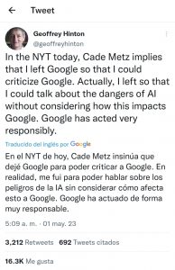 Hinton, nacido en Londres en 1947, »el padrino de la inteligencia artificial», confiesa se ha retirado de Google no para hablar mal de la compañía con la que participó durante 10 años, sino para alertar a la humanidad sobre los avances que rápidamente puede tener dicha creación. Ya que asegura que Google ha actuado responsablemente. Más cabe mencionar, también resalta que tal descubrimiento en manos de EUA y CHINA, desde una perspectiva financiera, pudiese convertirse en un freno de mano consciente o un arma letal para la sociedad.